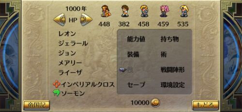 今更ロマサガ2 実は昨年同時期にやっていたのですが、 またちょこちょこやりたいなと思いまして再スタート 当面の目標は レオンパーティー全員のHP999 というわけで、自分の中での定番であるレオン育成計画がんばります 本日のハイライト